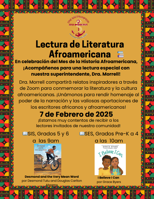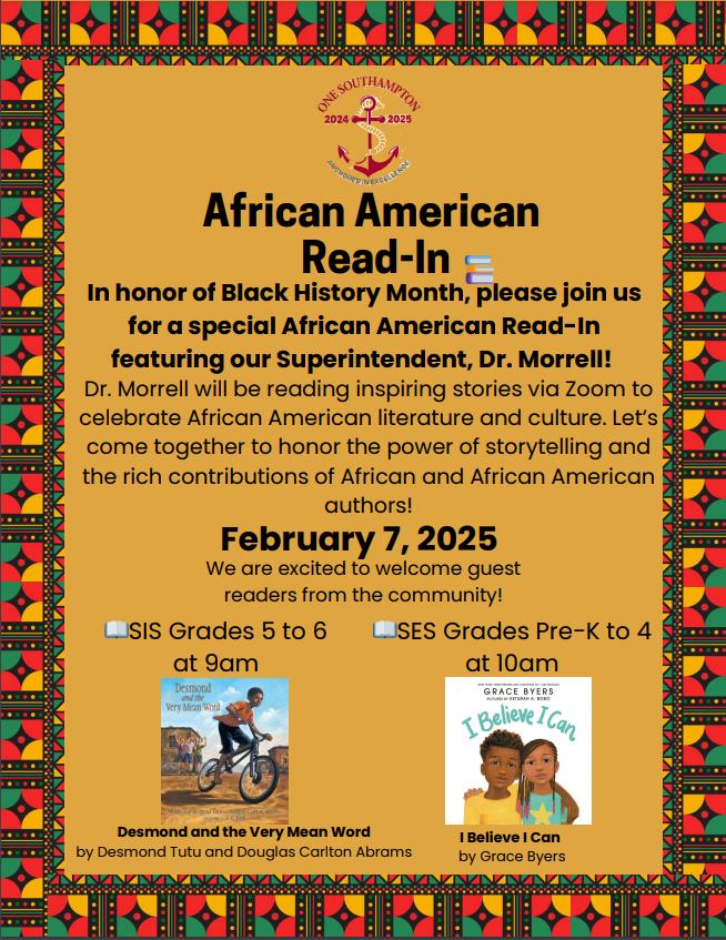 It is with great honor and pride that we invite you to join us in celebrating Black History Month through our African American Read-In on February 7, 2025. This special event is an opportunity to uplift and celebrate African American voices, literature, and storytelling within our schools. We are seeking community members, parents, and caretakers to serve as guest readers at Southampton Elementary School and Southampton Intermediate School to share books and stories that highlight the rich history, culture, and contributions of African Americans. If you would like to participate as a guest reader, please fill out the following form via the link below no later than February 5, 2025.