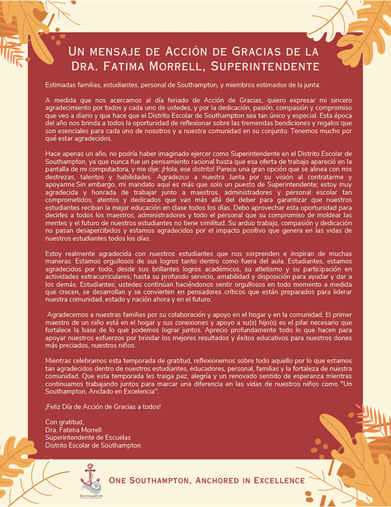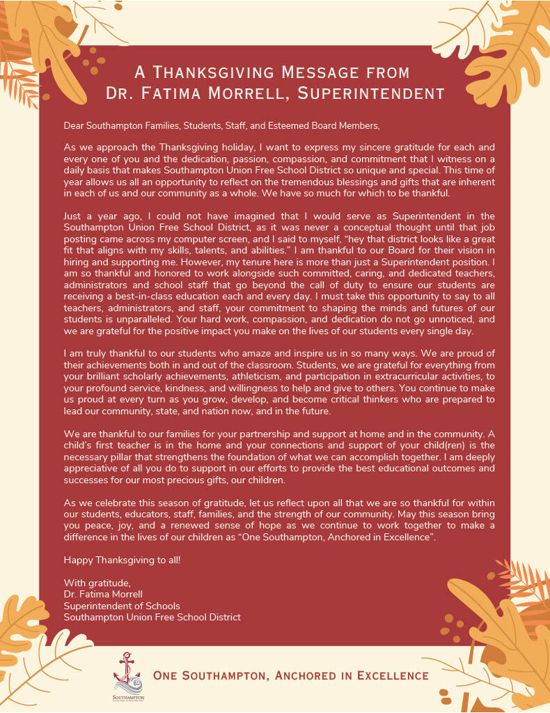 Happy Thanksgiving From Superintendent Fatima Morrell
