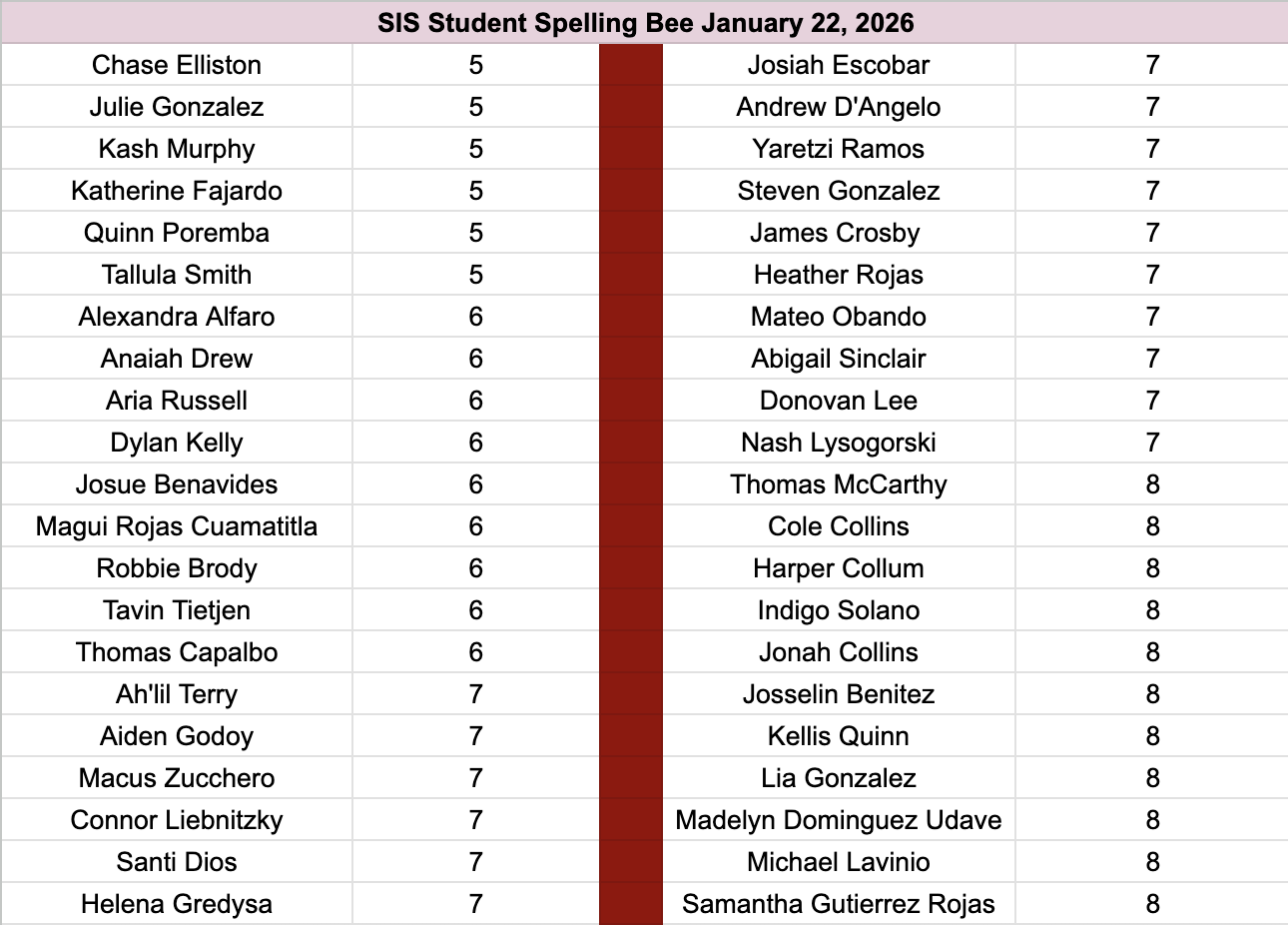 The SIS Annual Spelling Bee will be held tomorrow, Thursday, January 22nd at 7:40 am in the SIS cafeteria. Our contestants have advanced from their classroom Spelling Bees and will now square off against one another for the honor of being the SIS Spelling Bee Champion!