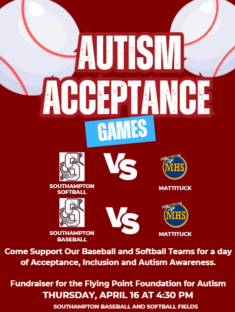 Come support Southampton Baseball and Softball teams for a day off acceptance, inclusion, and awareness on Thursday, April 16th at 4:30 at the Southampton Softball and Baseball Fields.